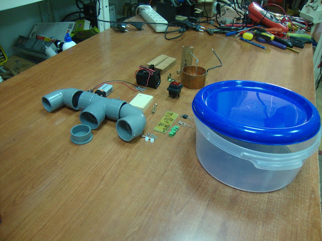 El detector ya terminado incluyendo las conexiones. Se introduce el mecanismo en el tupper (queda suelto pero ajustado), se pone la tapa y... listo: